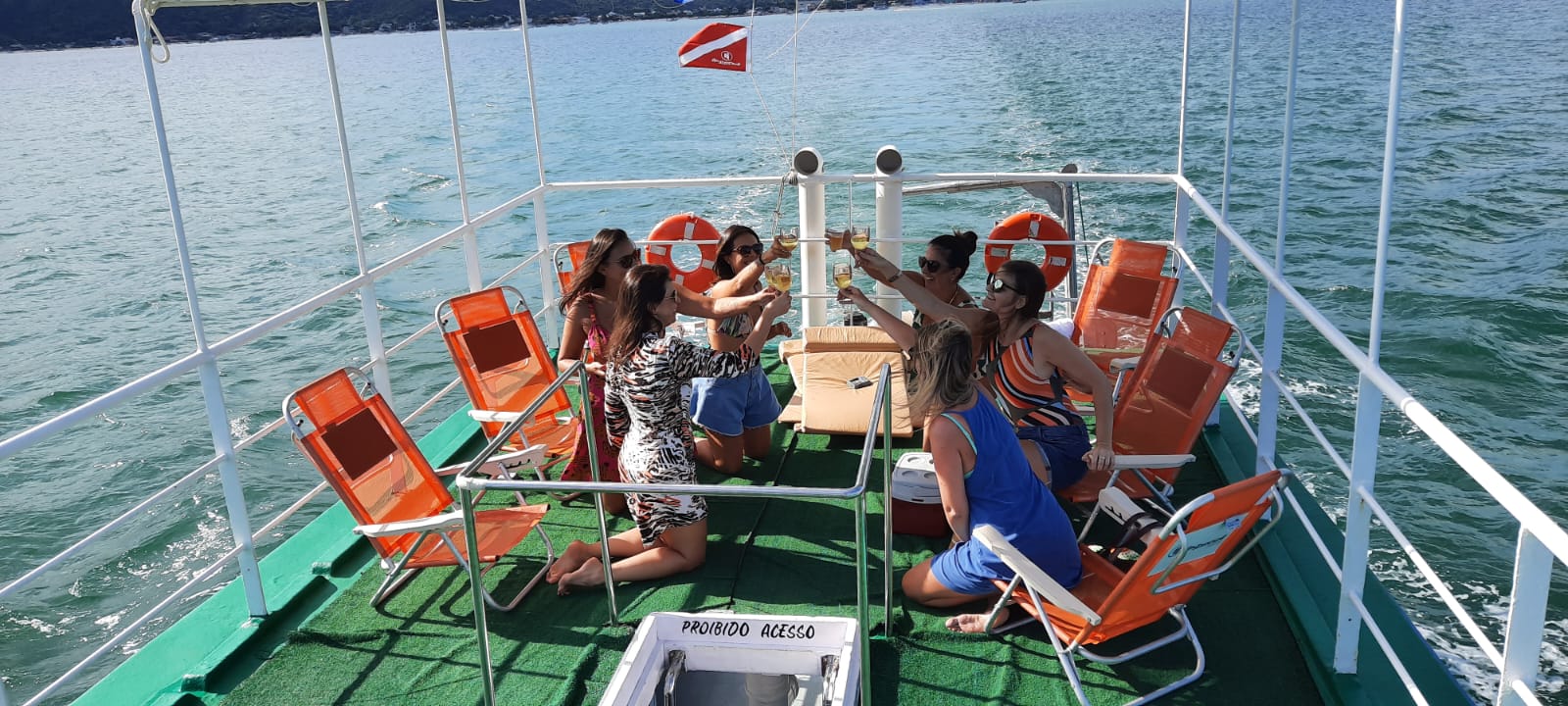Sobre itens de segurança, embarcação aprovada pela capitania dos portos para navegar em mar aberto, conta com todos os itens de segurança, coletes salva-vidas, balsas, oxigênio a bordo e kits de primeiros auxílios.